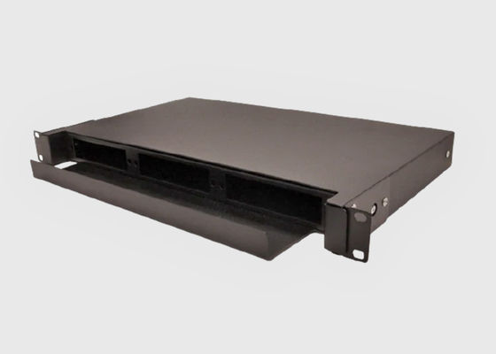 繊維光学のパッチ盤のシャーシ(2501-500)の台紙、1U STの排気切替器、クイック リリース締める物、45度の働く位置、Recessableのアダプターの土台が付いている空のパッチ盤の面板は同じ設計の他、大きい左舷同一証明のラベル、24のx単信ST (24の繊維)の港と交換可能なスペースを最大にする。